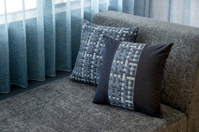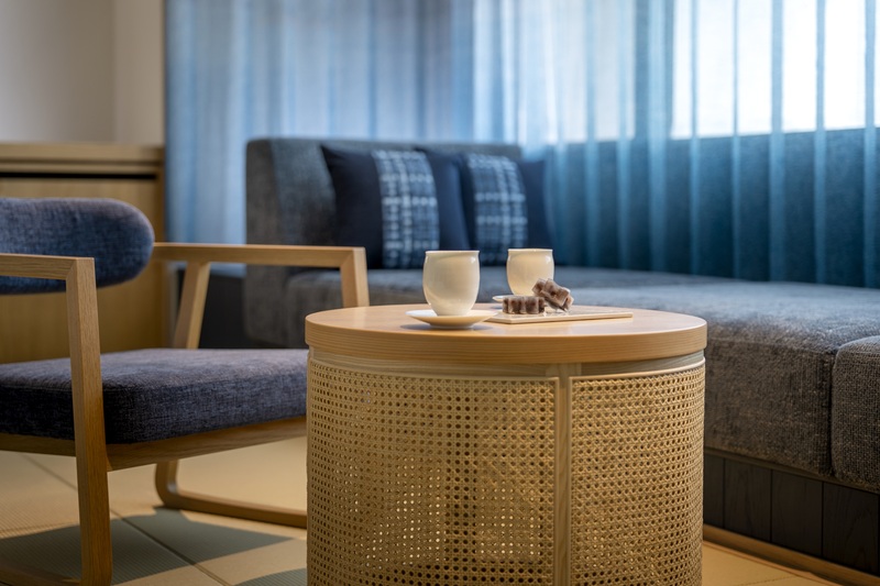 ソファのクッションには、広島県福山市を中心とする備後(びんご)地域の特産「福山デニム」を使用。伝統工芸「備後絣(びんごかすり)」の技術をルーツに持つ、深みのある藍色が空間を引き締めます。