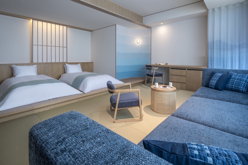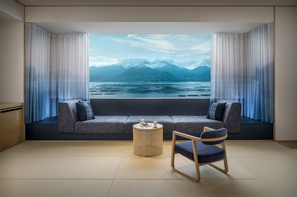 「海霧」とは、暖かい湿った空気が冷たい海面に接することで発生する霧のことです。島々が点在する瀬戸内海では海面近くに多く発生し、初夏には空と海と島々が美しいグラデーションを描きます。客室では、この幻想的な風景をデザインとして表現しています。 窓辺には景色を独占できるロングソファが配置され、窓の両側を囲むグラデーションカーテンが、海霧のような柔らかい雰囲気で外の景色と室内をつなぎます。