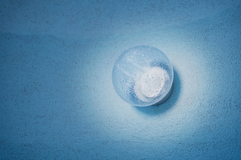 照明には、香川県特産の高級石材「庵治石(あじいし)」の粉を混ぜて作られた「庵治ガラス」が採用されました。瀬戸内海を思わせる穏やかな蒼色が特徴です。照明の背景となる壁は左官仕上げで、瀬戸内海のグラデーションを表現しています。