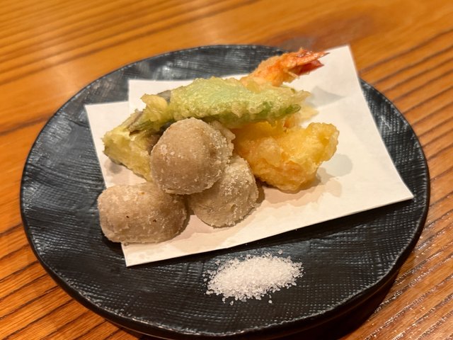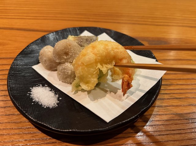 天ぷらは海老の尻尾まで丁寧に仕上げられ、衣はサクサク、身はぷりっとした食感です。