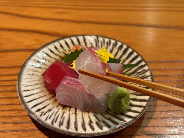 お造りはまぐろ・鯛・はまちの3種盛り。鮮度もよく、ボリュームも程よい。