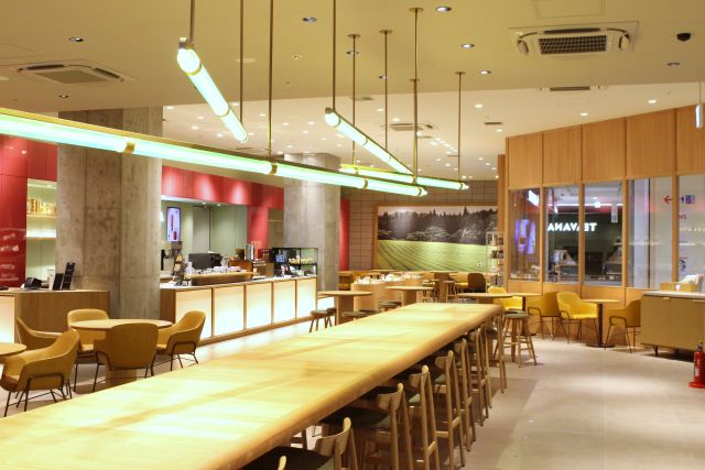 店内は西日本最大規模を誇る広さで、ベビーカーや車いすでも通りやすいゆったりとした設計。ベビーカーをそばに置いたまま座れる席も多く、シームレスに配置された座席が開放感を演出しています。