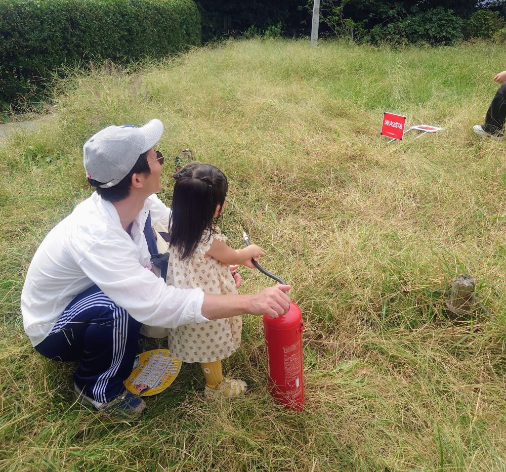 消火器の使い方体験では「ピンポンパン」のかけ声とともに、小さな子どもが楽しそうに挑戦していました。