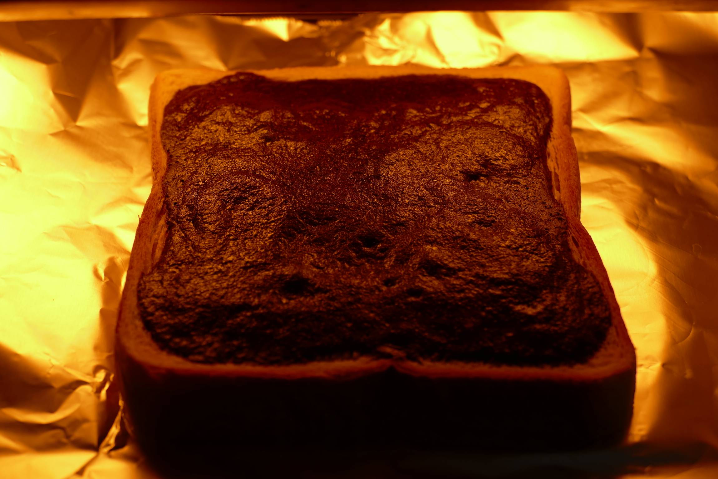 トースター1000W前後、もしくは230℃前後で4~5分焼きます。耳がこんがり色づき、ココアペーストの表面がふつふつと沸いたら取り出して完成です。お好みで分量外の純ココアパウダーや粉糖を表面にふりかけてください。