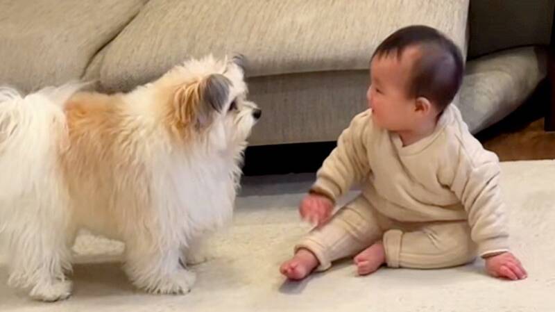 はいはいする赤ちゃんの正面から『おかえり!』と尻尾を振りながら歓迎するまめたくん。何度もお顔を近づける様子は『楽しかった?』とでも聞いているようで微笑ましい限り。