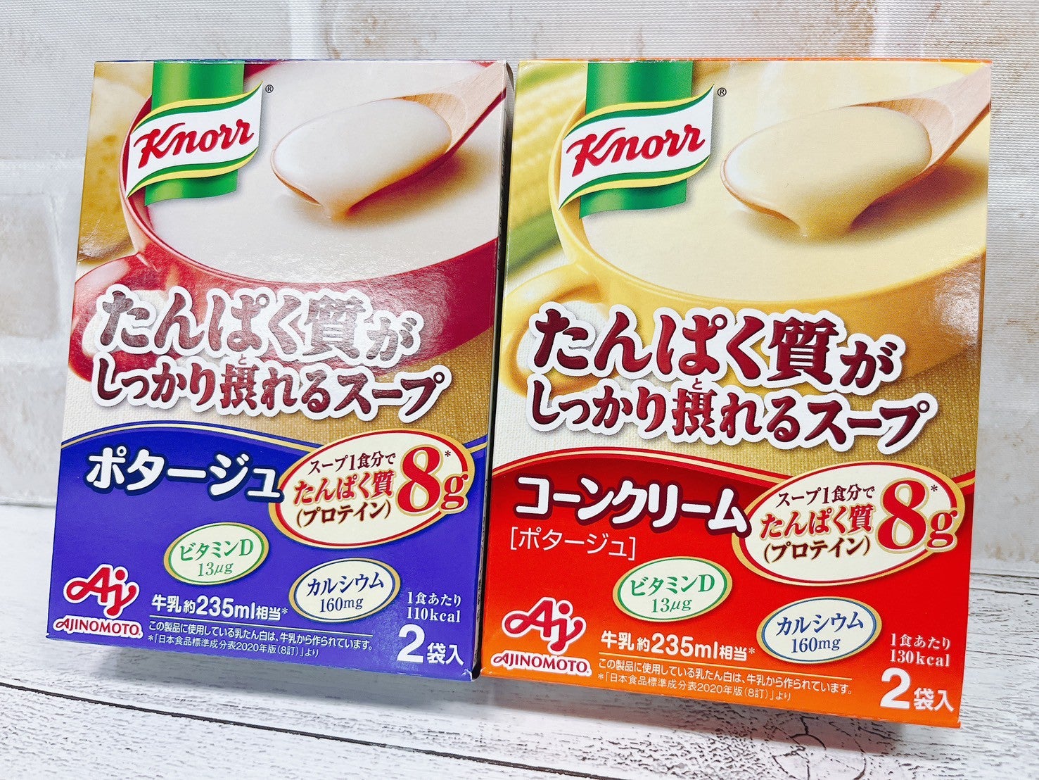 いつもの食事で、おいしく、手軽にたんぱく質補給ができます。味は2種類。コーンクリームとポタージュ。