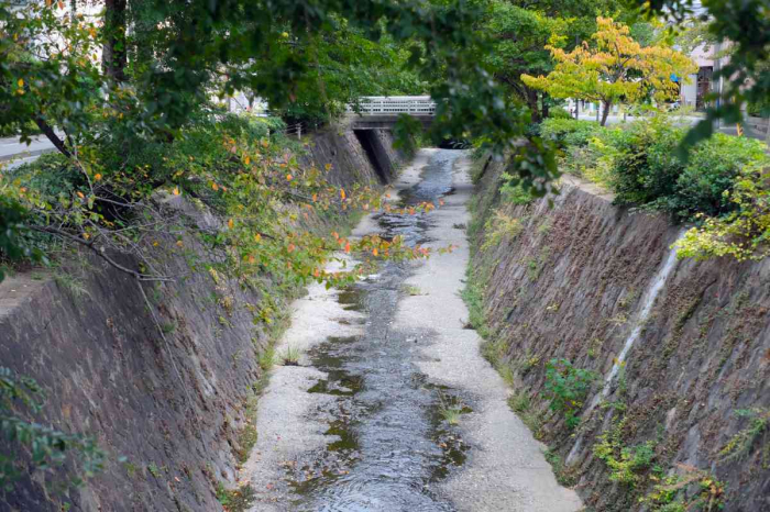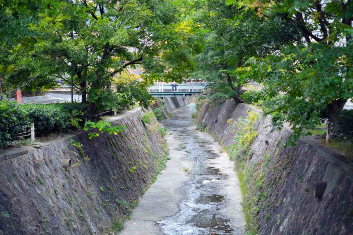 橋の下には二級河川である「西郷川」が流れ、西灘駅を通過する阪神電車をかなり近くで眺めることができます。