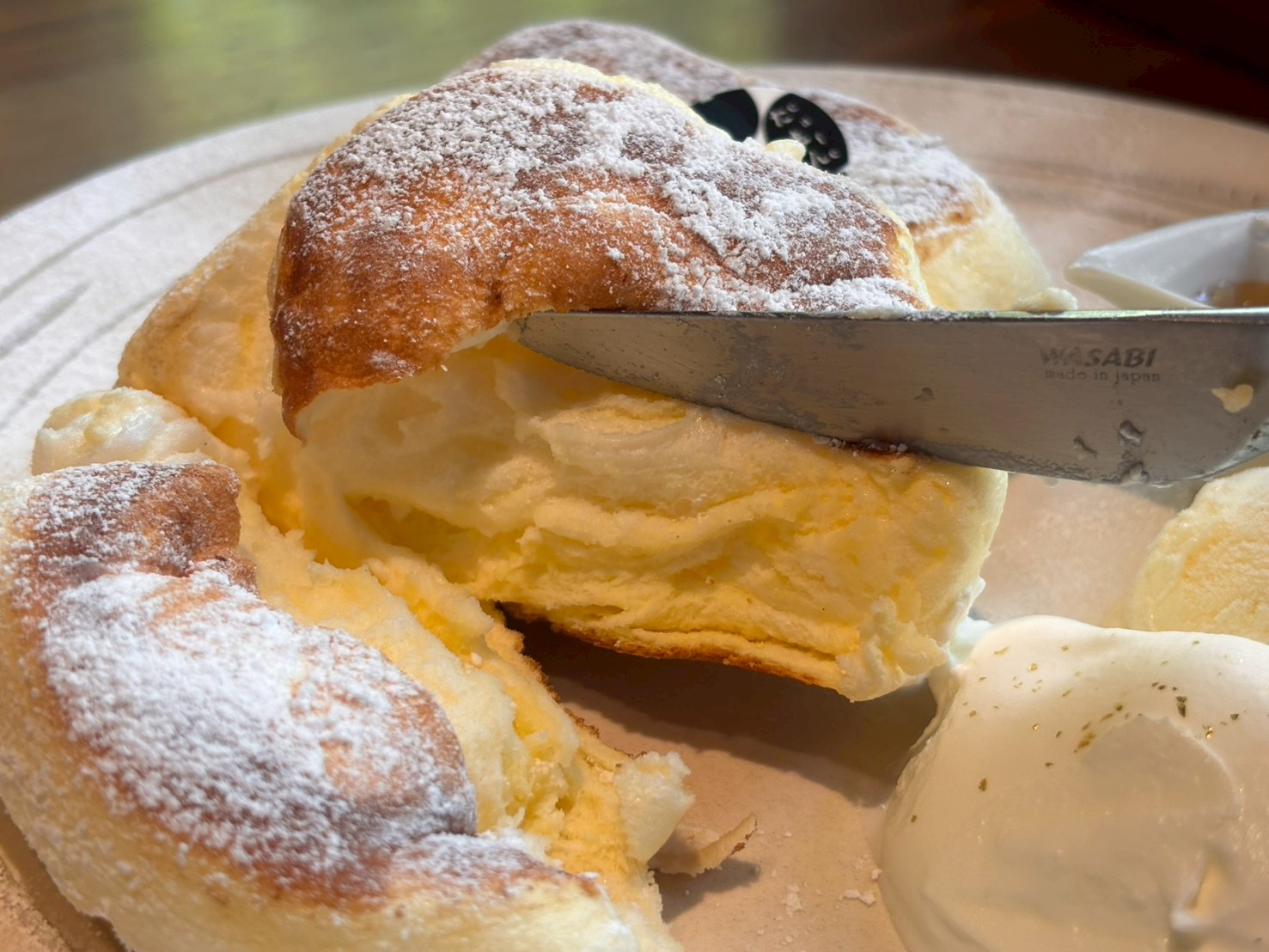 ナイフの先から伝わってくるふわしゅわな食感!口にふくむと、米粉ならではの軽やかさとやさしい甘みが広がり、生地そのままでもおいしくいただくことができます。