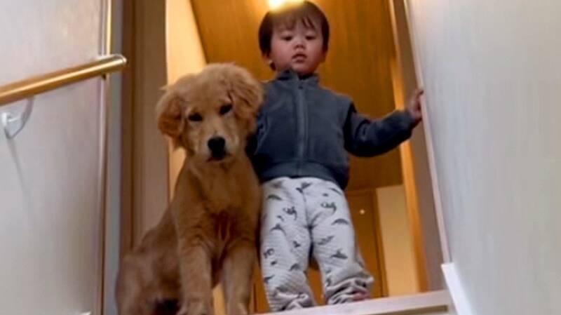 その後も赤ちゃんのそばではしゃぎ回ったり、赤ちゃんをじっと見つめながらお手々やしっぽをパタパタさせたりして、「追いかけっこする!?」「ねえ、遊ぼうよ!」とアピール。テンションが上がりすぎて、そばで見守っていたママさんに激突してしまう場面も。一生懸命な姿が可愛くて、思わず頬が緩みます。