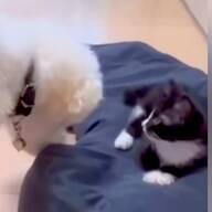 赤ちゃんはまだあまり動けないので、まめ君に遊びに誘われてもキョトンとするばかり。それでもまめ君は、諦めずに赤ちゃんを誘い続けます。別の日には、赤ちゃんのおもちゃを鼻先でツンツンした後に、「おチビちゃんのおもちゃで遊ぶ?」と聞くように赤ちゃんのお顔をペロペロ。