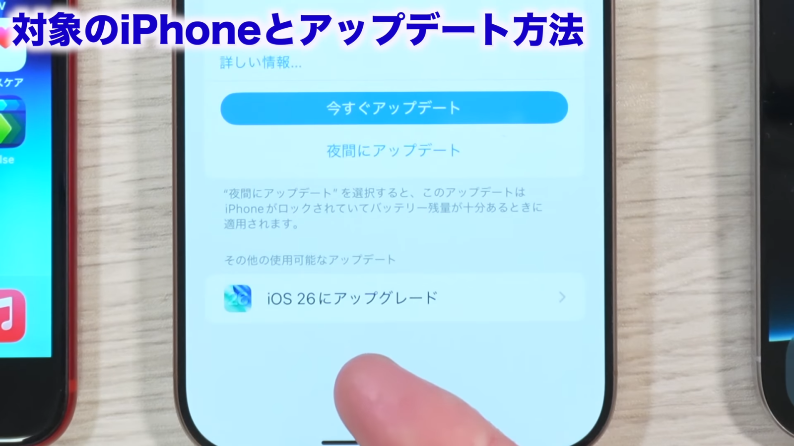 対応機種は、iPhone SE(第2世代以降)、iPhone11以降です。iPhoneXやiPhoneXS以前は、iOS26にアップデートできないので、注意してください。
