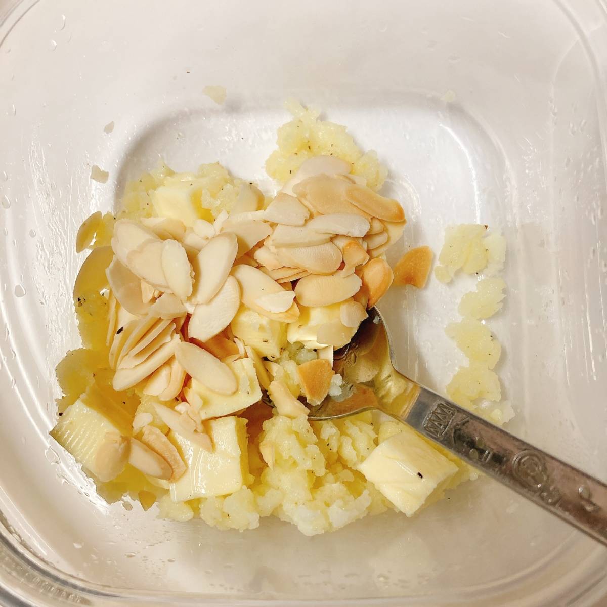 なじんできたらチーズとアーモンドスライスも混ぜ、器に盛り付けたらできあがりです♡
