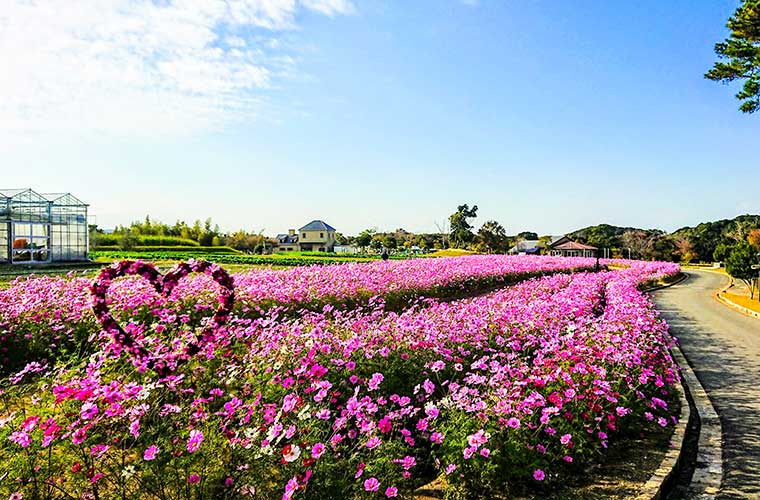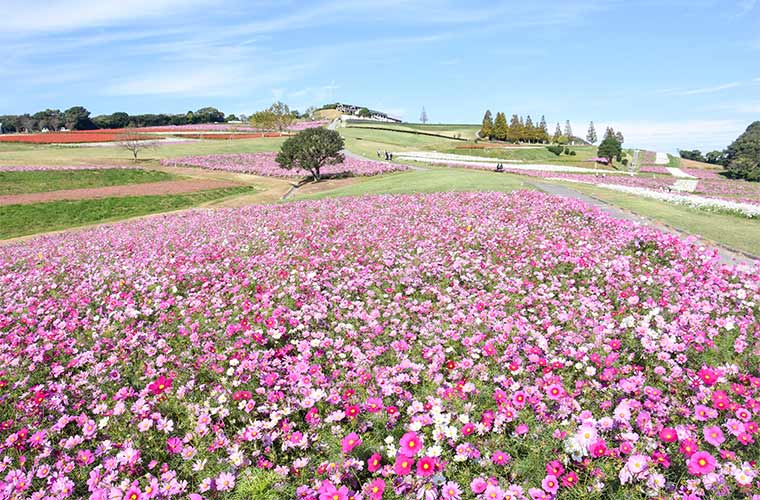 公園前の農地を花畑として活用し、約400万本の秋の風物詩・コスモスが花のじゅうたんのように咲き誇ります。園内には大型遊具や多目的広場、農産物直売所などもあり、家族で一日楽しめる大人気スポットです。