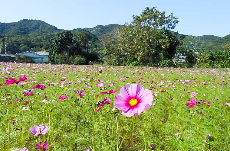 たつの市揖保川町馬場(うまば)地区では、休耕田でコスモスを栽培しています。今年は夏場の高温多湿の影響で、例年のようにコスモスを鑑賞することは難しいかもしれませんが、山や畑に囲まれてどこを切り取っても絵になる光景が広がります。カメラを片手に秋の散策を楽しんでは。