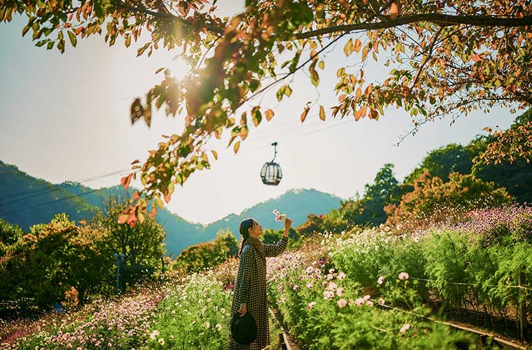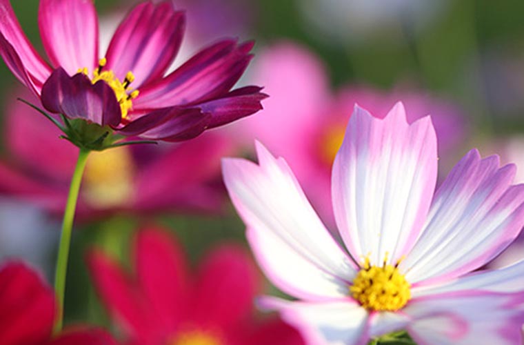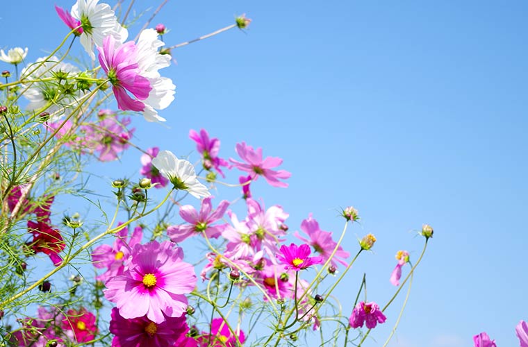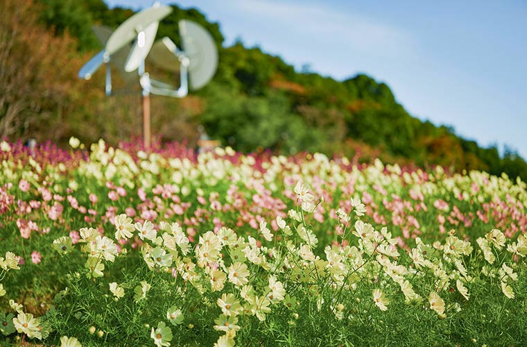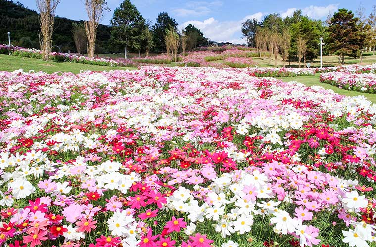 秋晴れの中、ピンクや赤、黄色など色とりどりのコスモスが風に揺れる姿を眺めれば、気分もリフレッシュ。芝生の緑とともに鮮やかな花風景を楽しんで。