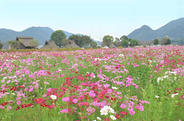 弥生時代後期や古墳時代後期の竪穴住居が復元整備された東有年(うね)・沖田遺跡公園の周辺には、約1ヘクタールのコスモス畑が広がります。竪穴住居とコスモスのちょっと珍しいコラボレーションに注目です。