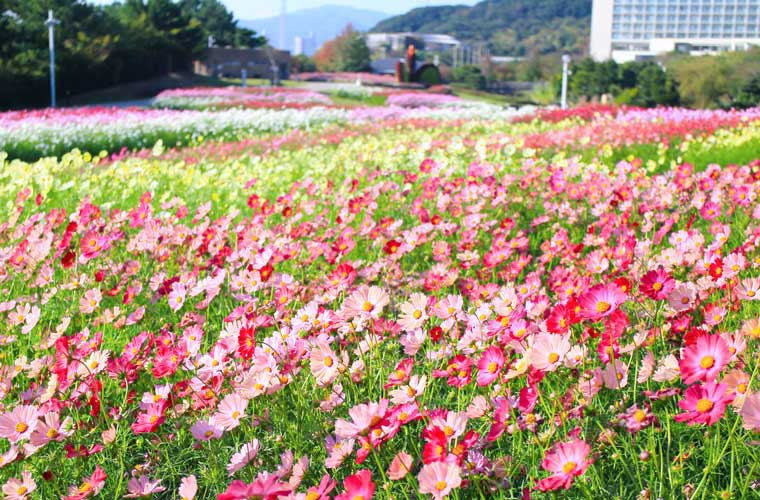 神戸市須磨区にある「神戸総合運動公園」は、野球場や競技場などのスポーツ施設、子どもが思いっきり遊ぶことのできる大型遊具やアスレチックなどがある広大な公園。秋になると小高い丘一面に約10万本のコスモスが盛大に咲き並びます。丘から見下ろすコスモスの群生は圧巻ですよ。