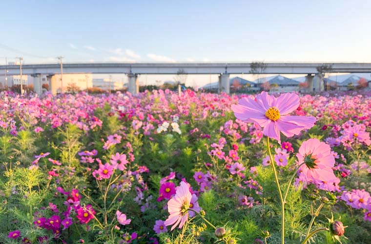 「計算科学センター駅北緑地」では、ポートライナーの車両をバックに2種類のコスモスが咲く絶景を写真に収めることができますよ♪ぜひお気に入りの一枚を撮ってみて。