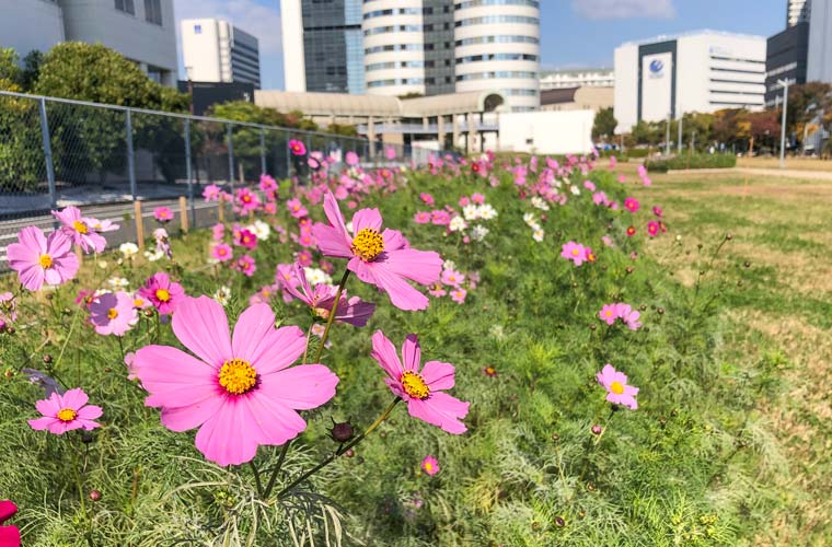 ポートライナー計算科学センター駅前にある「計算科学センター駅北緑地」、市民広場駅を降りてすぐの「市民広場南緑地」はそれぞれ駅近くにあるコスモスの穴場スポット。