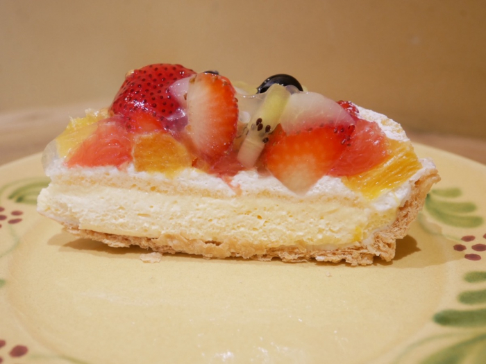 この日は、色とりどりのフルーツをふんだんに使った「タルト・メリメロ」をチョイス。オレンジ、ルビーグレープフルーツ、キウイ、メロン、イチゴなどの7種のフルーツが美しく盛り付けられ、生クリームやスポンジ、カスタードクリームが層になったタルトは、味のバランスも絶妙です。