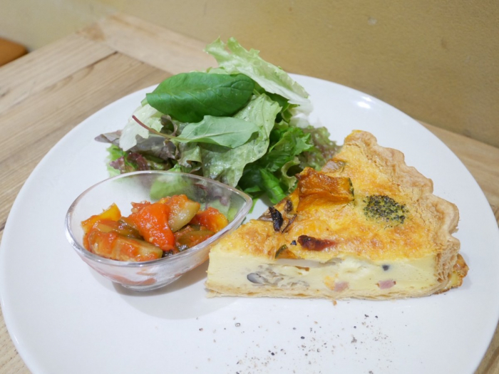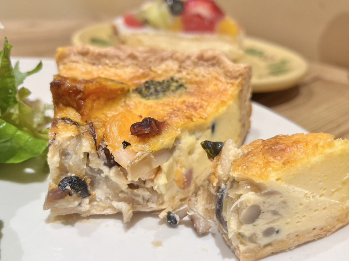 この日のキッシュは、ブロッコリーやかぼちゃ、ベーコン、エビなどの具材たっぷり。ふんわり焼き上げられた生地は、外はサクッと中はしっとり。ひと口食べるごとに、野菜やベーコンの旨みがじんわり広がります。