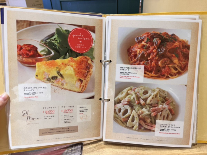 こちらが今回のお目当てのお食事メニュー。レギュラーメニューの「キッシュプレート」や時期によって内容の変わるパスタメニューなどが提供されています。