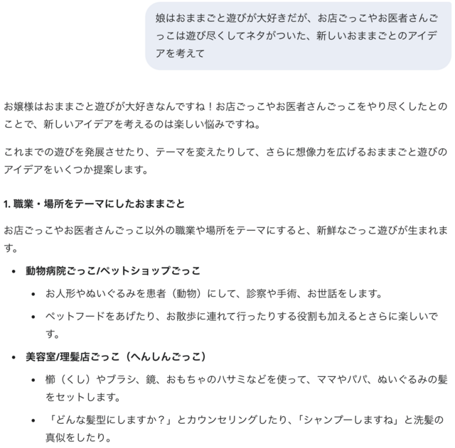 汪:私は「ごっこ遊び」の内容を、Geminiに相談しています。たとえば、「娘はおままごと遊びが大好きだが、お店ごっこやお医者さんごっこは遊び尽くしてネタがつきた。新しいおままごとのアイデアを考えて」とか。