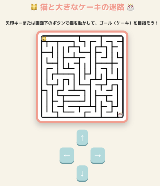 汪:では「スタートに猫がいて、猫がチャレンジする設定で迷路を作って。ゴールに大きなケーキを用意して」と依頼してみましょう。すると、ものの数分でゲームができるようになります。ほら!