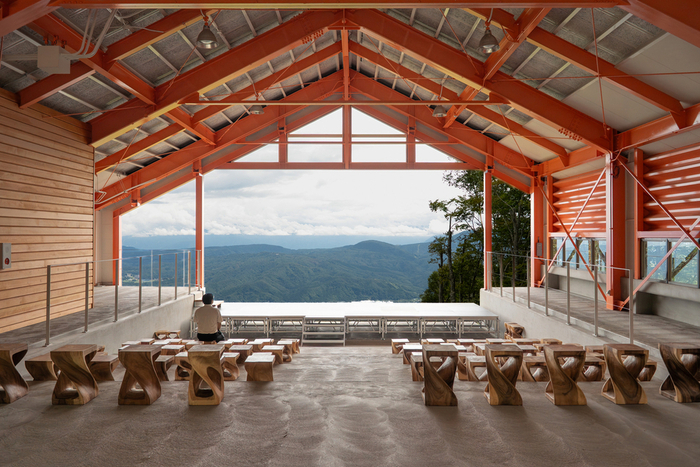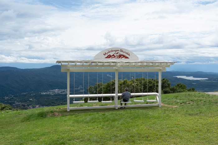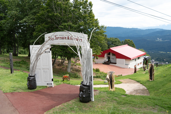 約15分の空中散歩の後に着く標高1300mの山頂駅周辺には、庭園や芝生広場を作り、芸術作品の展示、制作をする場とした。今後県内外の大学生や作家に呼び掛けて利用してもらうという。野尻湖や斑尾山、妙高高原の町並みが望めるブランコベンチ、木々の間で休めるテーブル席、妙高山の湧き水をたたえた水盤が印象的なカフェも備え、ゆったりと過ごせる。