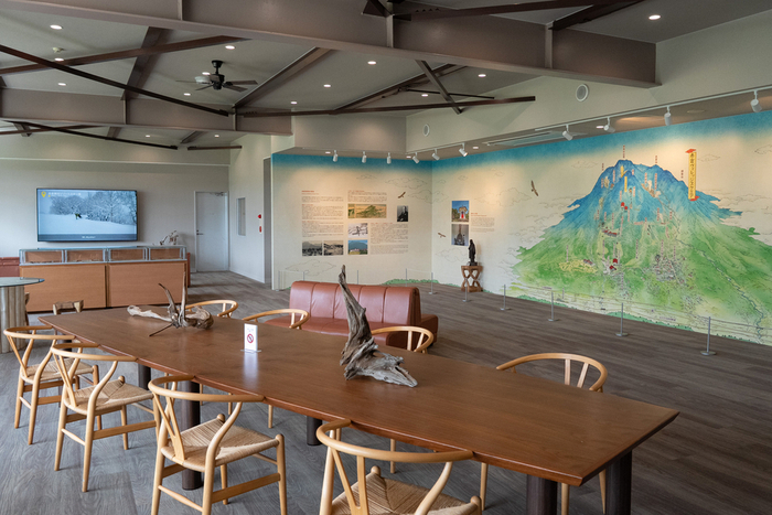 スカイケーブル乗り場の山麓駅舎内ホールは、観光客を迎える玄関口として、赤倉温泉や周辺地域の歴史、観光スポットをパネルや動画で紹介するスペースにした。