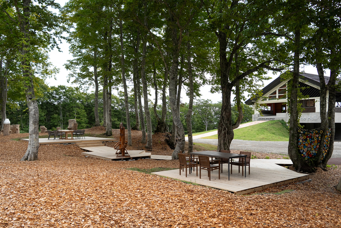 《画像:木々の間でゆったり過ごせるテーブル席やベンチ》