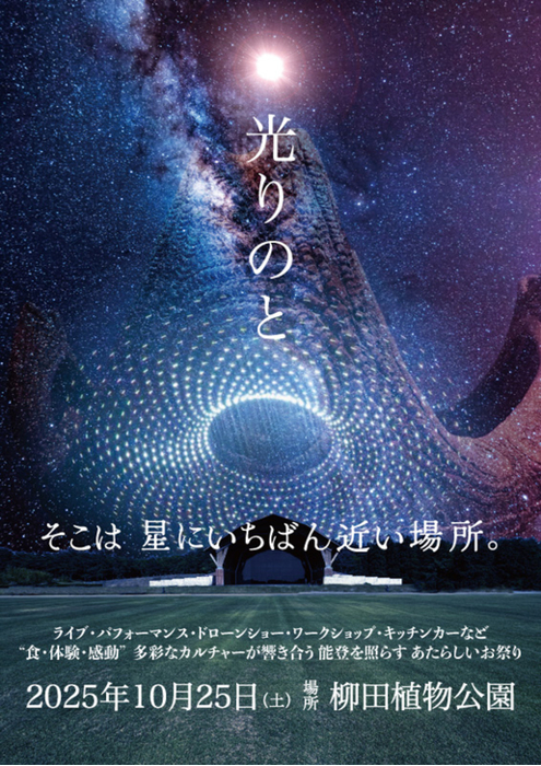 令和6年能登半島地震で被災した地域の復興を願い、能登の大きな魅力である“星空”をテーマにした新しいお祭りで、ライブやパフォーマンス、ドローンショー、ワークショップ、キッチンカー、打ち上げ花火など、多彩なコンテンツが楽しめるイベントです。