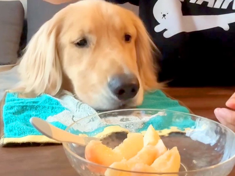 この日、飼い主さんはゴールデンレトリバーの「コロッケ」くんに食べさせてあげたくて、今年初めての桃を買ったそうです。