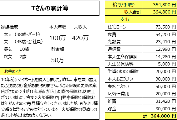 FPオフィス「フォルテシモ」へ依頼されたお客さまの家計簿を、mymoで診断する【うちの家計簿】。今回は38歳女性、パート勤務Tさんの家計簿です。会社員の夫と子ども2人の4人家族です。