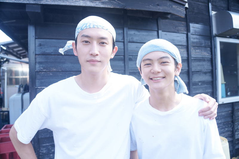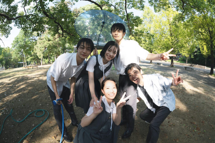 さらに、杉野(13年後の日向役)と中条(13年後の麗役)がお茶目に敬礼ポーズを取る様子や、同じ“佐藤日向役”を演じた齋藤と杉野が醤油工場を前に肩を組むレアなショット、さらには當真と齋藤、そして池端(麗役)、黒崎(フーヤン役)、吉澤(カワケン役) ら、高校生活を彩る若手キャスト5人が木漏れ日の中でビショビショになりながらも楽しげな表情を見せる姿も。