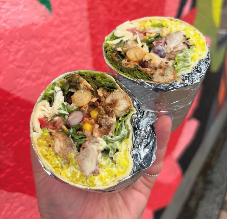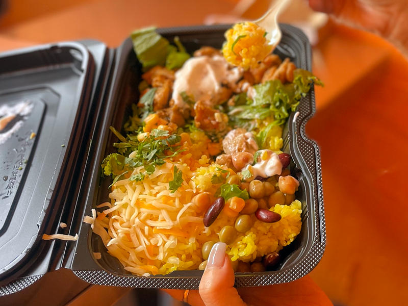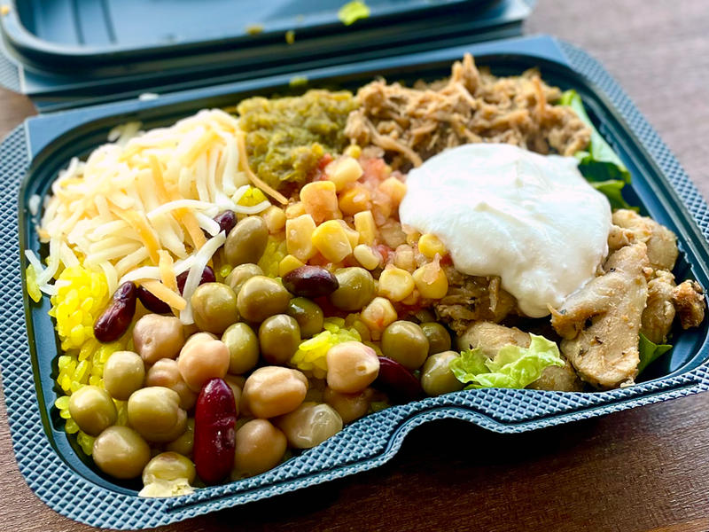 ブリトーと同じ具材をボウルに盛り、スプーンで混ぜて食べるスタイル。ターメリックライスにホロホロ肉、彩り野菜、豆、ソースがのり、底からざっくり混ぜるほど肉×ライス×クリーミーソース×フレッシュサルサが一体化して味変も楽しい。おすすめはチキン&ポークのミックスで、香ばしさ→濃厚さの食べ比べが一椀で完結。栄養バランスも良く、忙しいランチにもぴったりです。