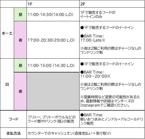 そしてなんと、ここで新たなお知らせです!2025年11月19日(水)より、マンチーズの2階で夜営業(バー)がスタートします!1階もディナータイムとして、これまでのランチメニューも提供されるそうですよ。詳細は以下のとおりです!