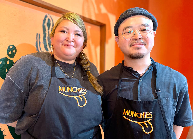 巨大でオシャレな壁画(アーティスト・澁谷忠臣さん作)が目印の『マンチーズ』。写真はマンチーズのお二人、クリスティーンさんとガジーくん。