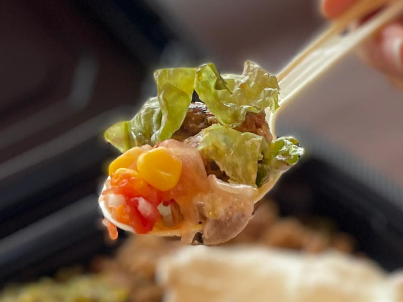 お肉以外にもターメリックライス、ミックスビーンズ、チーズ、レタスなど具材たっぷり。ホロホロ肉×シャキレタス×ホクホク豆のコントラストで栄養バランスも◎ 見た目に反して意外とさっぱりで、豪快なのに最後まで飽きない計算されたバランスがすごい!