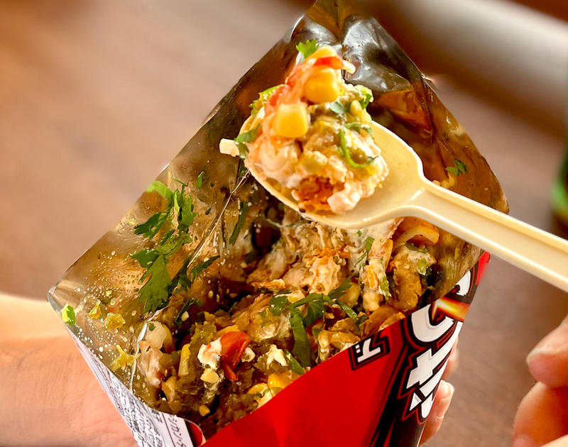 ひと口で「バリッ、ザクッ」の快感。冷たい野菜と温かいお肉、クリーミーでスパイシーなソースが混然一体で、旨いし楽しい!スナックの塩気にソースの旨味、ピリッとハラペーニョが重なって手が止まらない“ドリロコス中毒”へ。ビールの相棒にも間違いなし!