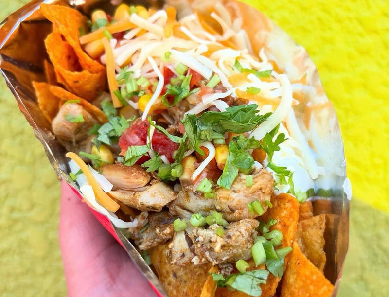 メキシコのストリートフード『ドリロコス』は、トルティーヤチップスの袋に肉・野菜・チーズ・ソース・ピクルスを豪快に入れて混ぜる“クレイジー”系スナック。もちろんマンチーズでも提供!袋ごとワシワシ食べる大胆発想がたまらず、名前の通り見た目も味もハマります。価格は850円。