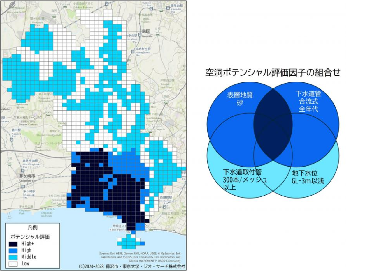 この地図「ポテンシャルマップ」は、藤沢市と東京大学生産技術研究所、民間のジオ・サーチの三者で共同で開発したもので、藤沢市の特徴を踏まえた空洞発生の四つの因子が多いところの色が濃くなっています。