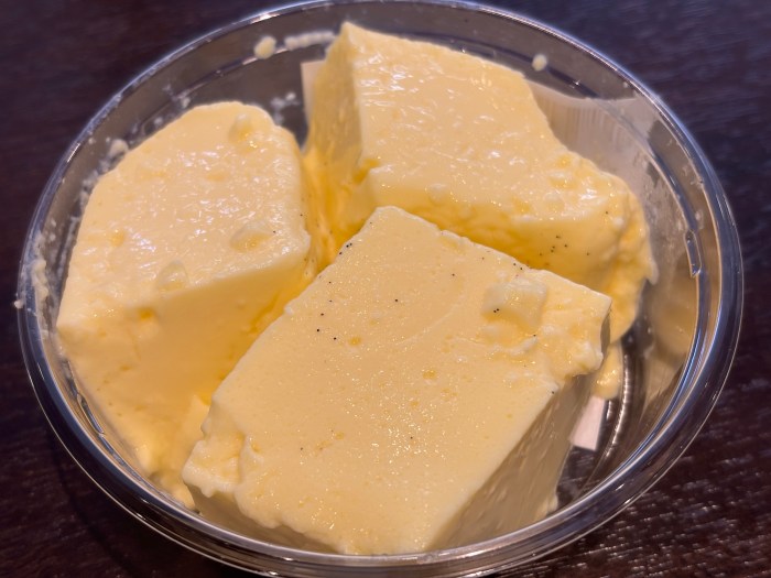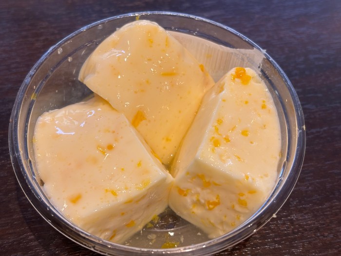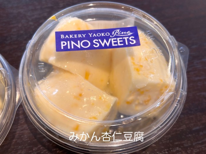 寄せプリンの横にひっそりと並べられていたこの杏仁豆腐。杏仁豆腐といえば、白一色のイメージが強い中、みかんの粒が入った薄黄色。