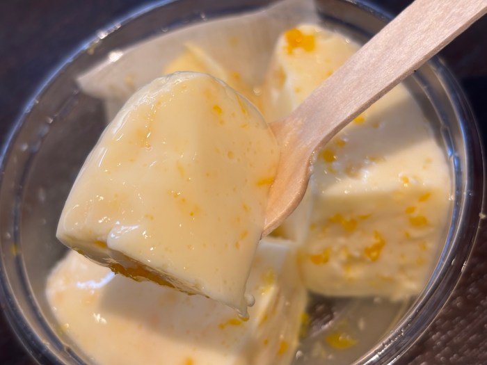 この「みかん杏仁豆腐」は似たような味がまったく思い出せない、オリジナリティあふれる味わいだった。ノーマルの杏仁豆腐ではなく、みかん入りであえて勝負に出たところがすごい。