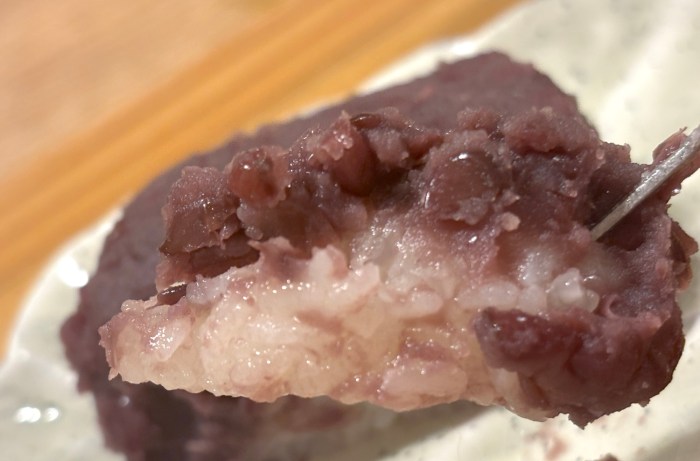 よく見れば、あんこの色が紫がかっている。これはいい小豆を使い、丁寧に作られたあんこの証拠である。餅米部分はやや甘さ控えめになってるからバランスがいい。お茶と合わせて1個余裕で完食!