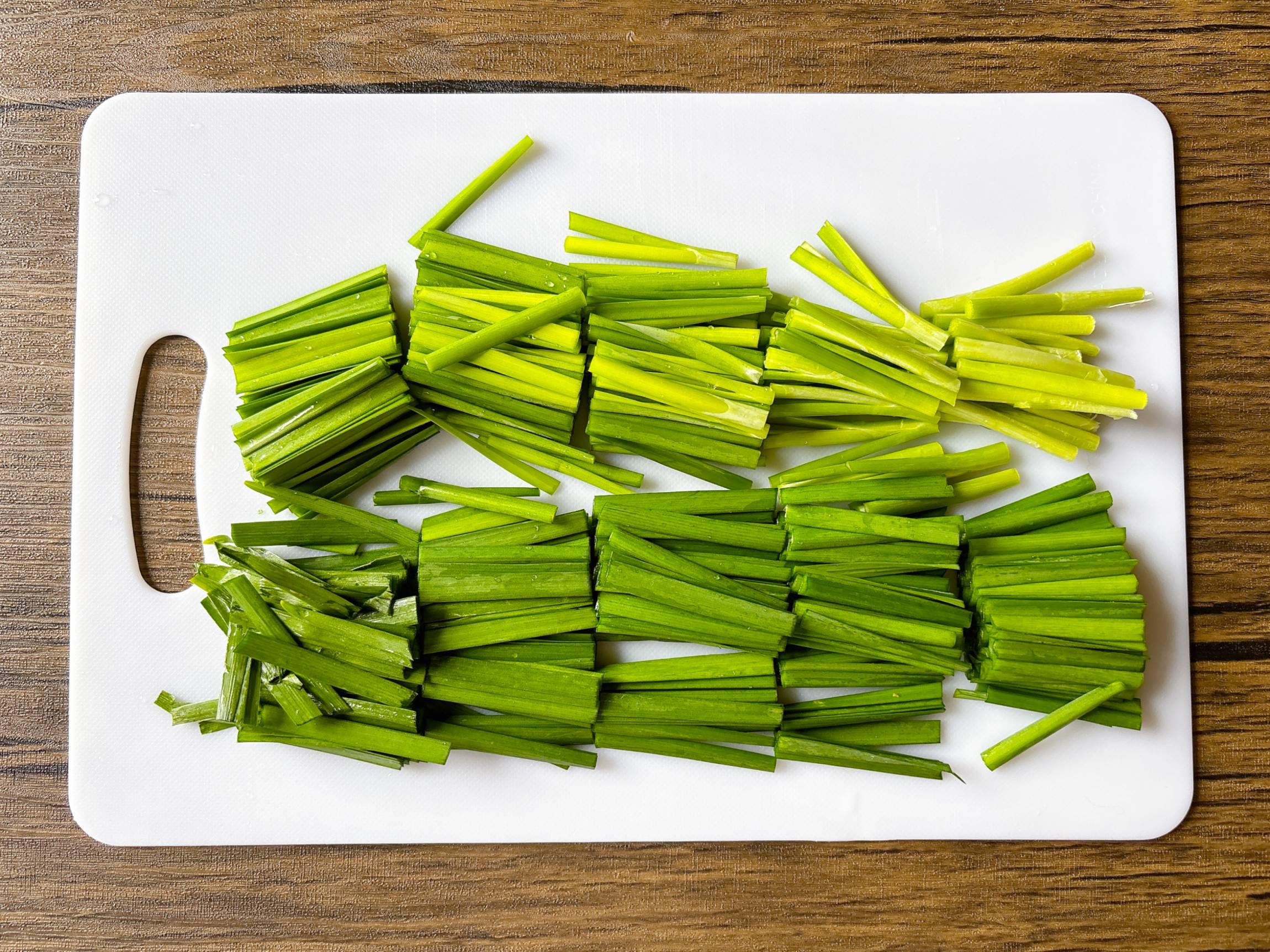 ニラはサッと洗って根元の硬い部分をカットし、4cm幅にカットします。