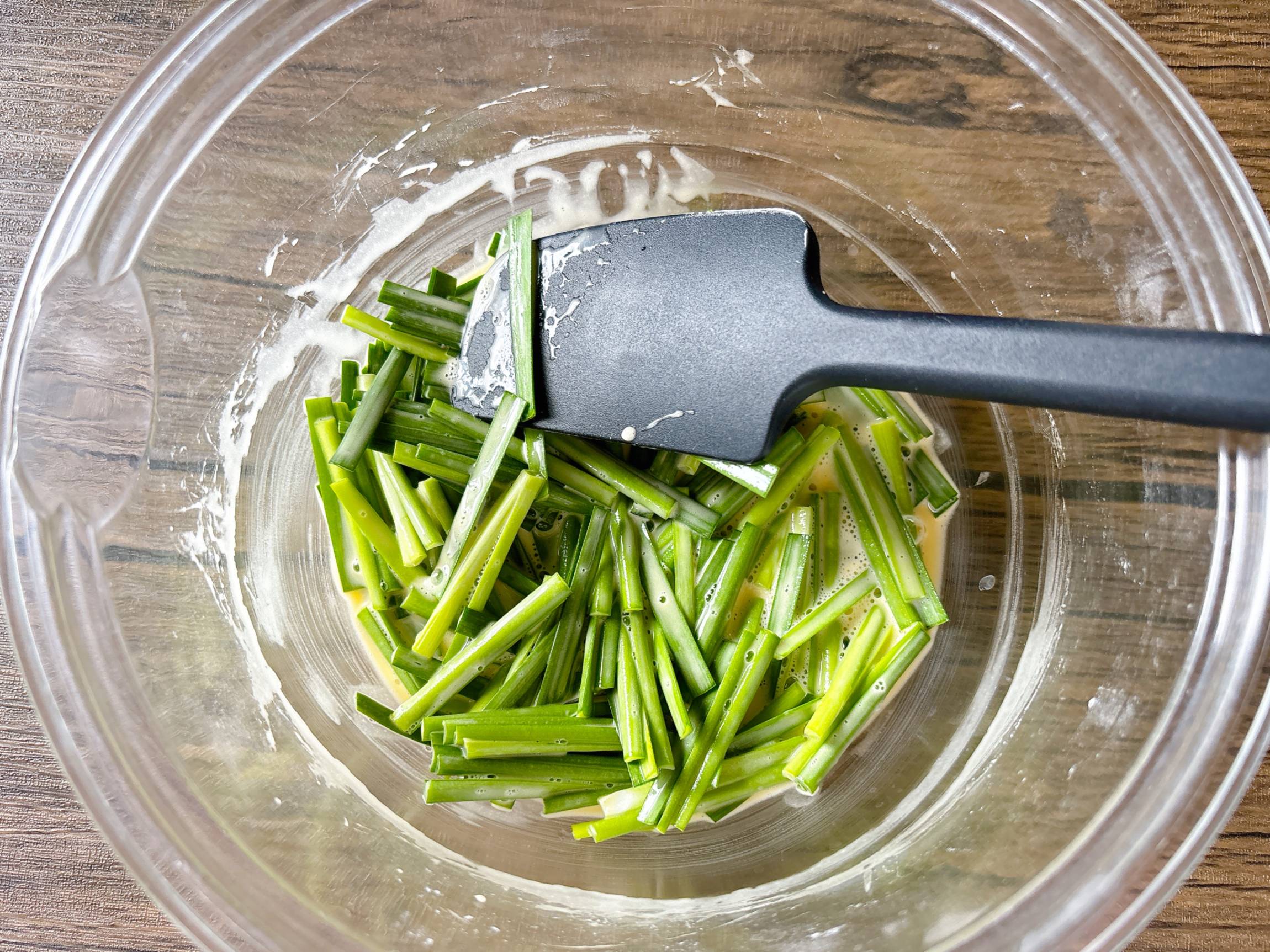 全体をグルグル混ぜ、硬いようなら水を加えます。ニラ全体に絡むようなサラッとした生地にします。