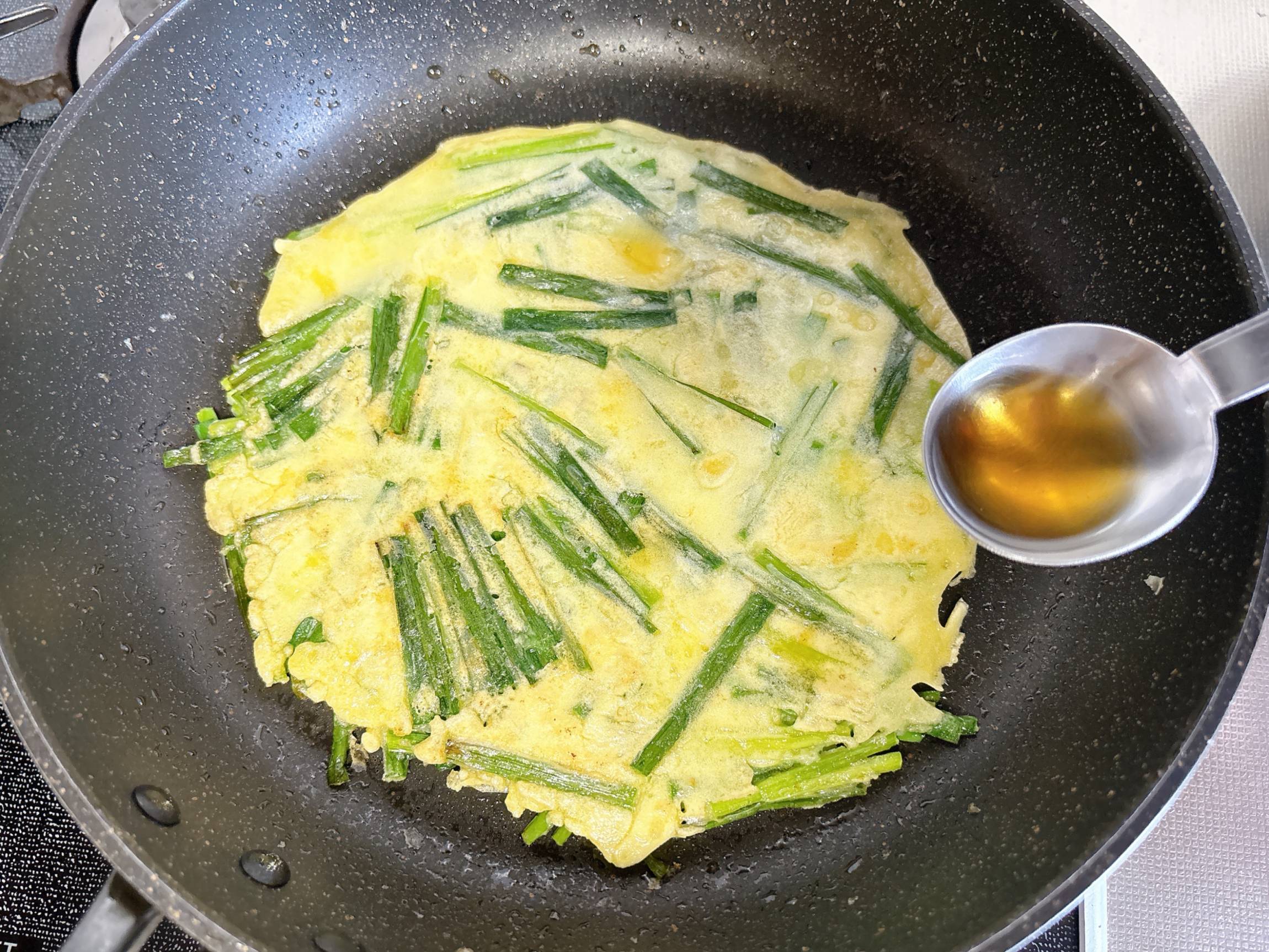 シンプルにニラだけでもおいしいですが、薄切りの玉ねぎやキムチ、チーズなどお好みの具材を加えてアレンジも可能です。ボリューム感を出したいときは、ツナ缶や豚バラ肉を少量加えてもよいですよ。