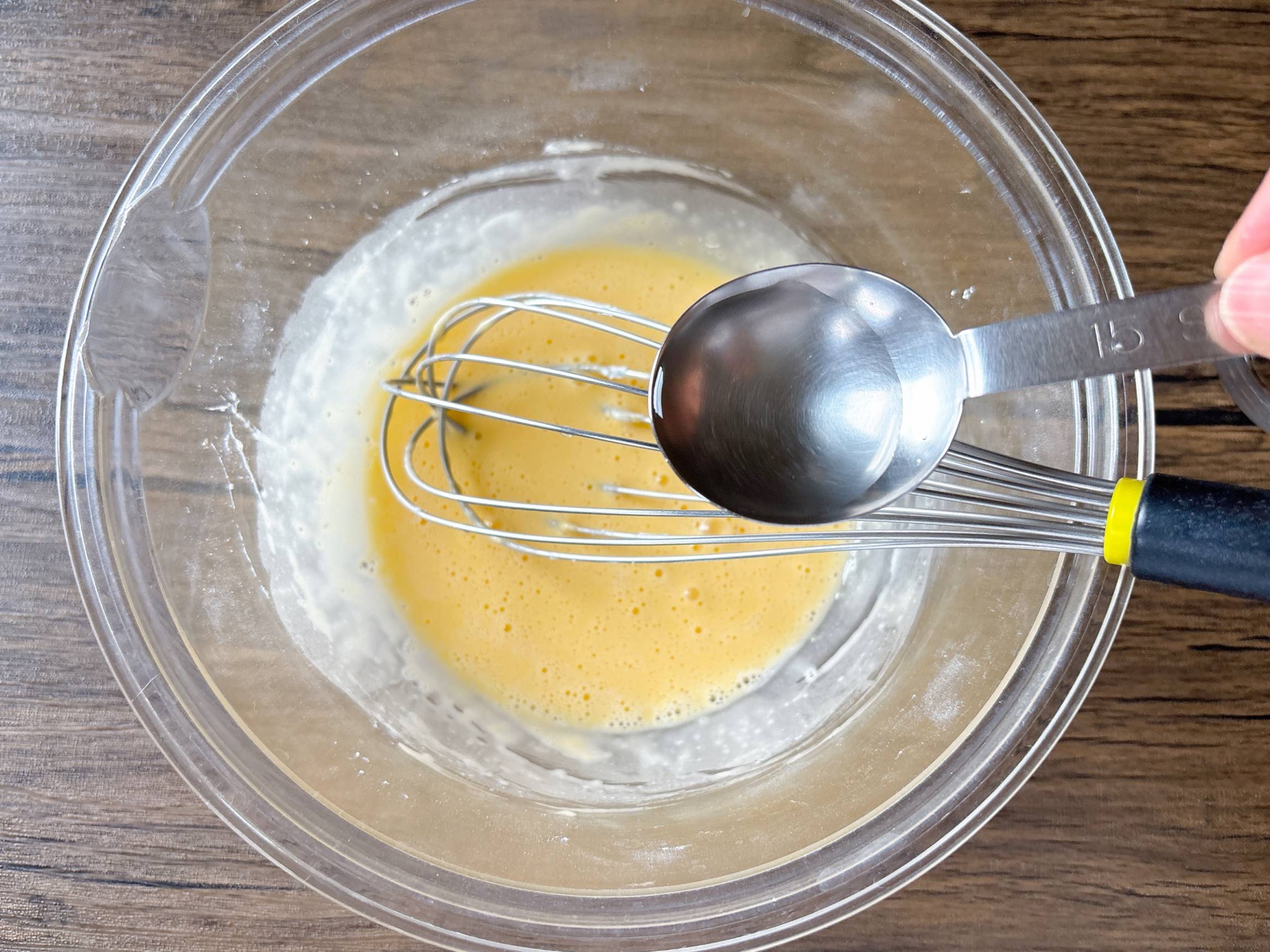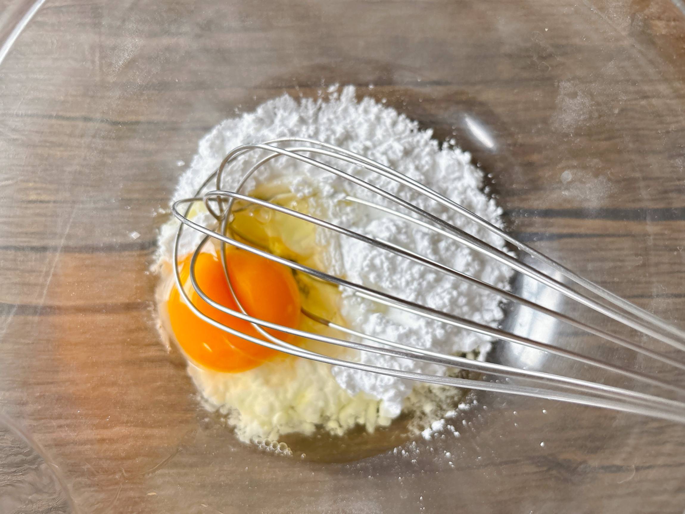 ボウルに片栗粉と塩を入れて軽く混ぜ、卵を割り入れます。