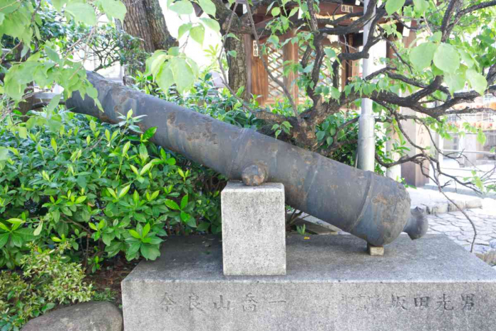 ワクワクしながら境内に入ってみると、なにやら左手に「神戸事件」の文字と神社には似つかわしくない大砲の姿が。穏やかではないですね…。